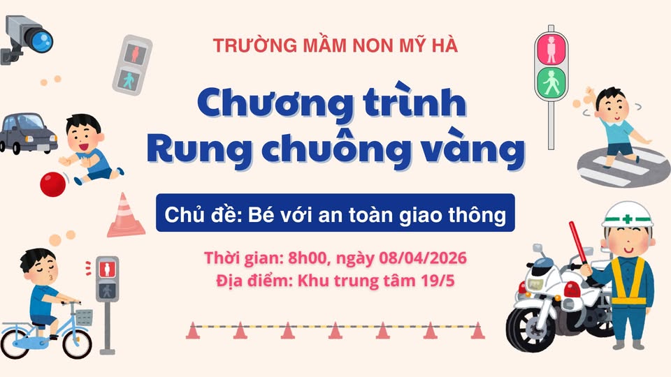 THƯ MỜI 🎉 🔔 RUNG CHUÔNG VÀNG 🔔 🌈 Chủ đề: Bé với an toàn giao thông Kính gửi: Quý Phụ huynh học sinh, Nhằm giúp các bé nâng cao nhận thức và hiểu biết về an toàn giao thông, đồng thời tạo sân chơi bổ ích, vui tươi và ý nghĩa, nhà trường tổ chức chương trình: 🎯 “Rung chuông vàng” – Bé với an toàn giao thông Thông qua chương trình, các bé sẽ được: ✨ Tìm hiểu kiến thức an toàn giao thông ✨ Rèn luyện tư duy, phản xạ nhanh ✨ Tham gia các hoạt động vui chơi hấp dẫn ⏰ Thời gian: 8h00, ngày 08/04/2026 📍 Địa điểm: Khu trung tâm 19/5 – Trường Mầm non Mỹ Hà 💌 Nhà trường trân trọng kính mời Quý Phụ huynh đến tham dự, cổ vũ và đồng hành cùng các bé. Sự hiện diện của Quý Phụ huynh là niềm động viên to lớn cho các con! ❤️ Xin trân trọng cảm ơn!